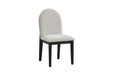 At the center sits a striking round dining table, crafted in a deep, rich finish that highlights its sculptural pedestal base. The open-arched design adds architectural interest while maintaining a light, airy feel. Paired with the table are four elegantly contoured dining chairs, upholstered in a textured light-gray fabric that offers both comfort and visual contrast. Their rounded backs and clean, solid wood frames echo the table’s modern aesthetic, creating a cohesive and inviting dining experience.