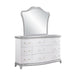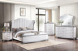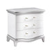 The Nina Bedroom Collection showcases exceptional craftsmanship and attention to detail. The bed features a luxurious, tufted high-back headboard, offering both comfort and visual appeal. Its sleek, white finish is complemented by elegant silver accents along the edges, creating a sophisticated contrast. The nightstand is designed with curved edges and three spacious drawers, accented with modern hardware in a brushed gold tone. The dresser offers ample storage with six deep drawers, providing both style and practicality. The mirror, with its soft, curved edges and silver-trimmed frame, adds a touch of elegance, perfectly complementing the overall design. The entire set is built with high-quality materials, ensuring durability while exuding a polished, contemporary aesthetic.