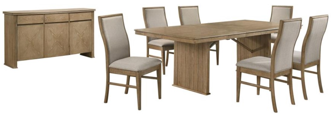 Includes: One (1) dining table, six (6) side chairs, and one (1) sideboard