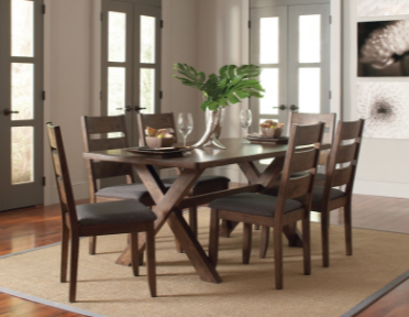 This fine 6-piece dining set that is highlighted by a rectangular table accompanied by four side chairs and a bench. Both the bench and table are constructed from solid Asian wood with a Knotty Nutmeg finish. Each also features a trestle-style base and crisscrossing legs for a sleek design.Read More