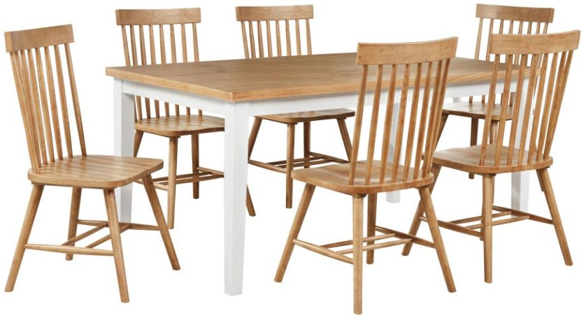 Graceful and relaxed, this seven-piece dining set blends farmhouse character with timeless appeal. A rectangular light ash tabletop rests on soft white legs, creating a charming two-tone contrast. Paired with windsor-style chairs featuring high spindle backs and gently contoured seats, it offers enduring comfort and casual elegance.Read More