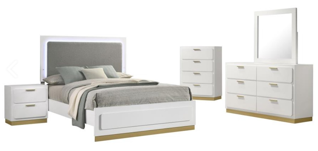 Upholstered headboard with touch LED lighting highlights a five-piece bedroom set