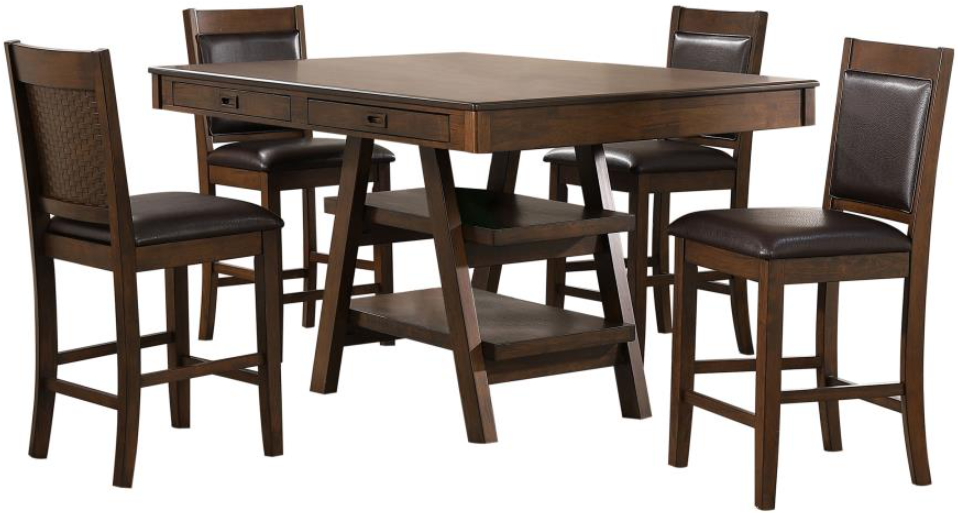 Each counter height stool offers padded seats, wrapped in a smooth brown leatherette, and a supportive frame with footrests and a backrest. Slide each chair up to the spacious table, set on top of a pedestal-like base with open shelves for storing service ware, linens and more. In addition, this dining set also keeps other essentials like flatware and linens stowed away in the two drawers until your next party.