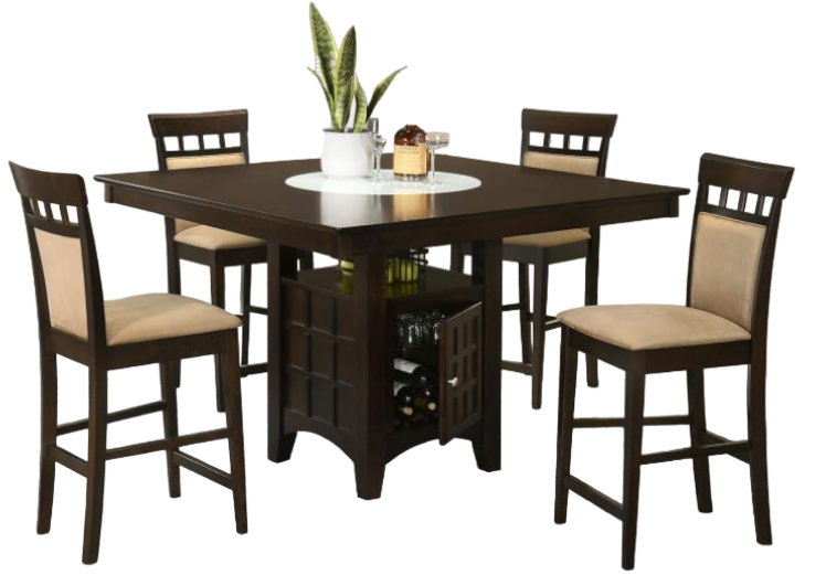Includes: One (1) counter height table and four (4) counter chairs