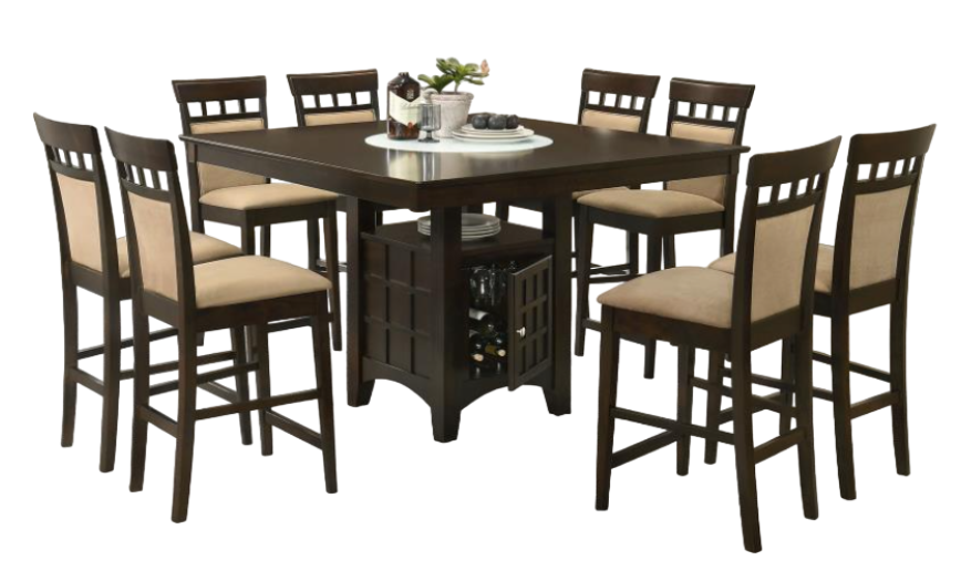 Includes: One (1) counter height table and eight (8) chairs