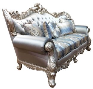 Cosmos Furniture's Ariel traditional style sofa in silver finish wood is luxurious and stylish. The Ariel sofa has a high back framed by beautifully carved detailed trim. Attention to detail is shown in the solid wood ornate and pierced carving surrounding a tight back and lose seat cushions, pocket coil seat inserts and a solid wood frame. The arms are gracefully rolled with and have nicely shaped face arm posts set upon skillfully carved cabriole legs and supported by a complimenting apron. The plush fabric is tailored to follow the shapes of the wood accents, crystal button tufting, and finished off with nailhead trim. Throw pillows are included. Matching pieces are sold separately.