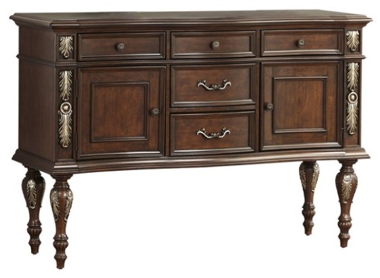 Cosmos Furniture's Rosanna traditional style dining server in cherry finish wood. The graceful elegance of our Rosanna collection makes every meal a celebration. Expertly crafted of solid hardwoods and resin with selected veneers, hand-rubbed rich cherry finish. Every piece is finely detailed with ornate carvings. The Rosanna server boast high turned spindle legs, all adorned with brush gold finish, and ample storage for your needs. The Rosanna Server, stand alone or with the complete set, will be a show stopper and having our guests asking where you got it! Matching Rosanna Dining Table, Rosanna Dining Chairs, Rosanna Dining Hutch and Rosanna Dining Buffet are sold separately.