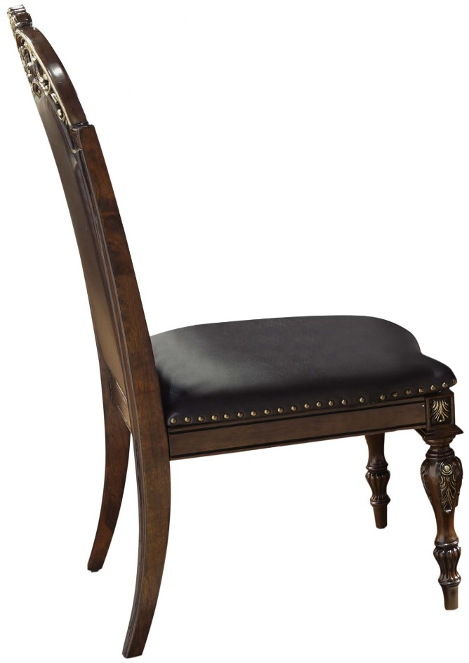 Cosmos Furniture's Rosanna traditional style side chairs in cherry finish wood. The graceful elegance of our Rosanna collection makes every meal a celebration. Expertly crafted of solid hardwoods and resin with selected veneers, hand-rubbed rich cherry finish. The Rosanna dining side chair has front turned spindle legs accompanied by finely detailed ornate carvings in a brushed gold. These handsome side chairs are upholstered in leather-like material. Matching Rosanna Dining Table, Rosanna Dining Chairs, Rosanna Dining Hutch, Rosanna Dining Buffet and Rosanna Dining Server are sold separately.