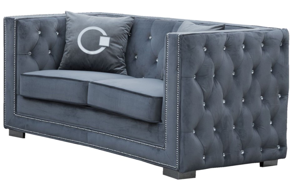 Cosmos Furniture's Zion modern style gray loveseat has steel legs with chrome finish. The Zion loveseat is elegant and eye catching and is the perfect addition to any space. Modern tufted design shown by the velvet gray color cover, crystal buttons and nail heads. The strength and beauty are guaranteed with sturdy wood frame and chrome legs. This Loveseat is bound to be the conversation piece. Throw pillows are included. Matching pieces are sold separately to complete the set.