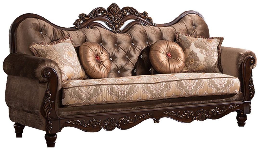 Cosmos Furniture's Zoya traditional style Sofa in cherry finish wood. Founded atop arrow foot legs, this Sofa's frame is constructed from solid carved wood in a cherry finish and is wrapped in coffee colored silk and chenille upholstery. Eye-catching updates, such as rolled arms, crystal button tufting, piping trim and a gently curved camelback seats, round out the design. Plus, with designer throw pillows this design is a great way to dress up the living room. Throw pillows are included. Matching pieces are sold separately.