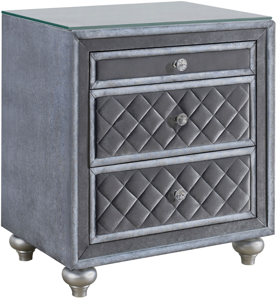 Include additional storage in your bedroom area with this nightstand from the Cameo collection, It has 3 drawers and a wood case finished in gray. Make a bold statement by incorporating this nightstand into your home.Read More