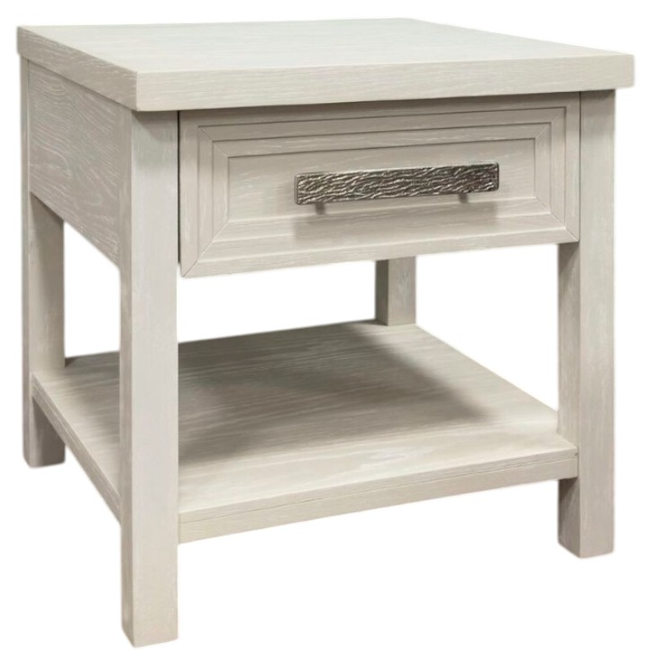 Designed for practical use, a functional drawer adorned with a broad, textured handle features protective felt lining and skillful French and English dovetailing, while a conveniently integrated USB port lends itself to practical utility. For a sleek and stylish addition to your home, the Avalanche End Table in Antique White delivers in quality and design.