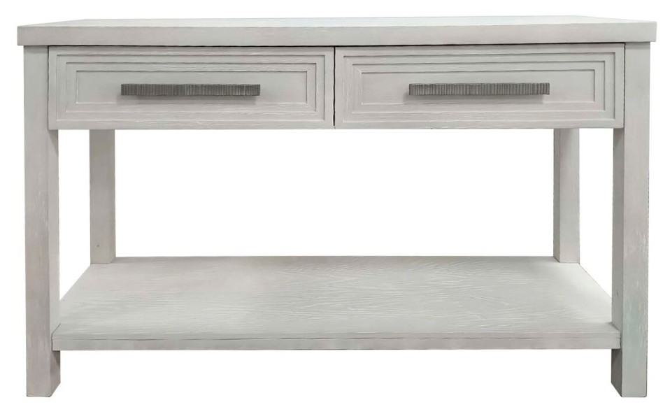 Designed for practical use, two functional drawers adorned with broad, textured handles feature protective felt lining and skillful French and English dovetailing. For a sleek and stylish addition to your home, the Avalanche Sofa Table in Antique White delivers in quality and design.