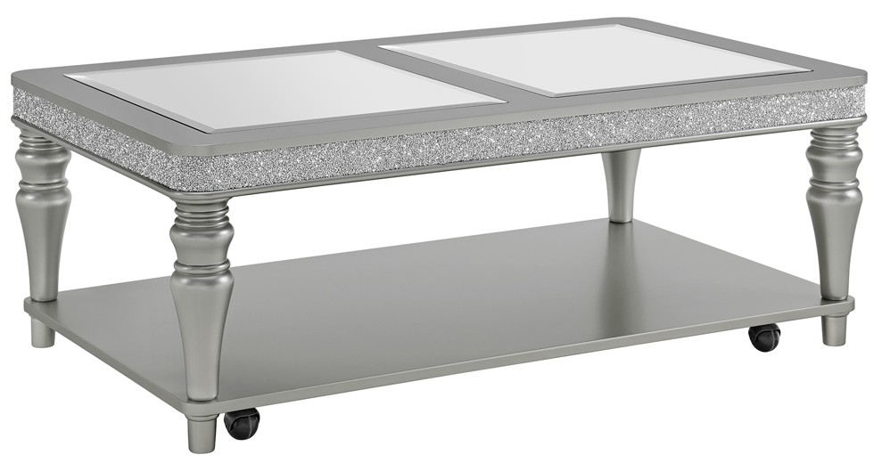 Convenient casters rest under this piece to simplify maneuvering the table throughout your space, while stylized legs and a glitter trim adorning the table’s perimeter elevate visual appeal. Designed for those seeking to add an elegant touch of luxury to their space, the Avril Coffee Table with Casters is just right.