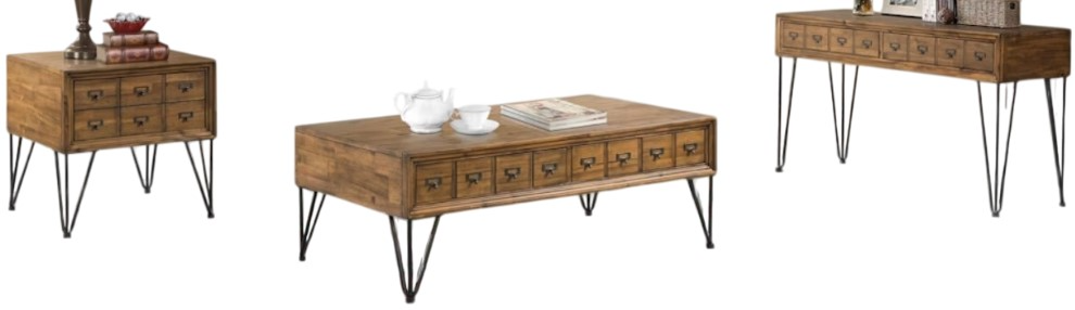 The end tables come with a pull out tray, perfect if you stepped up your home decor game and need just a little extra space for a beverage. The drawer and tray fronts feature an apothecary style look, in a bronze metal. The dark metal hairpin legs complete the look and pairs beautifully with the light walnut finish.