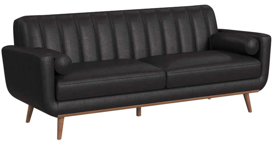 The Horizon sofa with wood front and 2 six inch bolster pillows is built with a frame fully upholstered in quality faux leather. Comfortable foam cushioning, decorative tufting on the backrest, and track arms forming sleek and modern lines, while an exposed front rail and wood legs highlight excellent craftsmanship.Read More