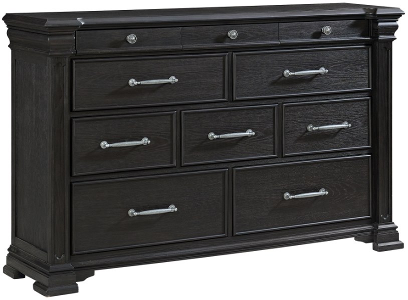 Decorative molding on the sleek, black finish adds visual appeal, while the top-row drawers are thoughtfully fitted with protective felt lining for your more delicate items. Traditional in style and ageless in appeal, the Kings Court 10-Drawer Dresser in Black is a perfectly elegant addition to your bedroom.