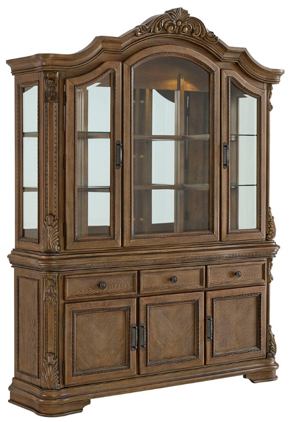 Elevate your dining room with the Madison Park Server and Hutch, a masterpiece of traditional elegance. Its rich walnut finish exudes warmth and sophistication, complemented by intricate ornate carvings that adorn every detail. The arched carved top and mirror back paneling add depth and reflect a timeless charm of classic design.Read More