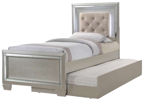 The Platinum youth full platform 4-piece bedroom set is sure to delight your glamour queen. The mirror glass trim is consistent throughout the collection while the tufted headboard and chic champagne finish complement this group.Read More