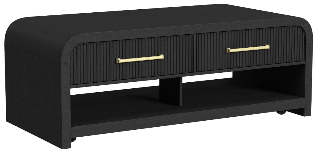 Convenient casters rest under this piece to simplify maneuvering the table throughout your space, while lustrous metal handles adorning intricately fluted drawer fronts elevate its visual appeal. Designed for those seeking to add a refined touch of luxury to their space, the Ridgemont Coffee Table with Casters is the perfect fit.