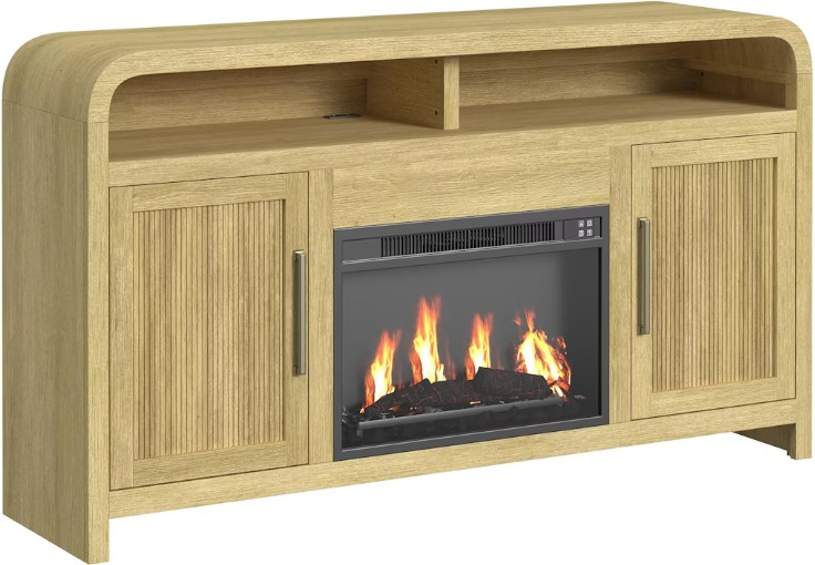 Accent your entertainment area with the refined style of the fireplace cabinet in natural. This piece artfully blends geometric and organic shapes by showcasing a rectangular tabletop with gently rounded corners. The cabinet door fronts easily become a focal point with their intricately fluted detailing and sleek metal handles.Read More