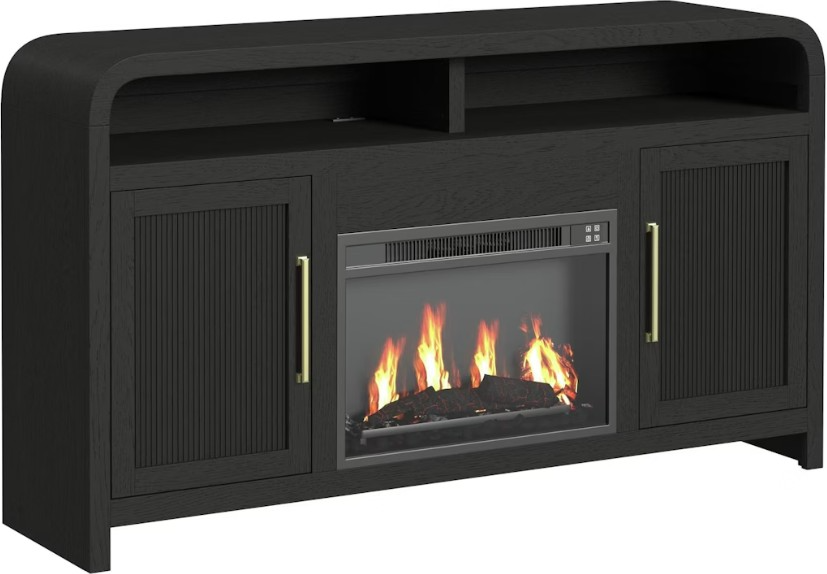 Accent your entertainment area with the refined style of the fireplace cabinet in black. This piece artfully blends geometric and organic shapes by showcasing a rectangular tabletop with gently rounded corners. The cabinet door fronts easily become a focal point with their intricately fluted detailing and sleek metal handles.Read More