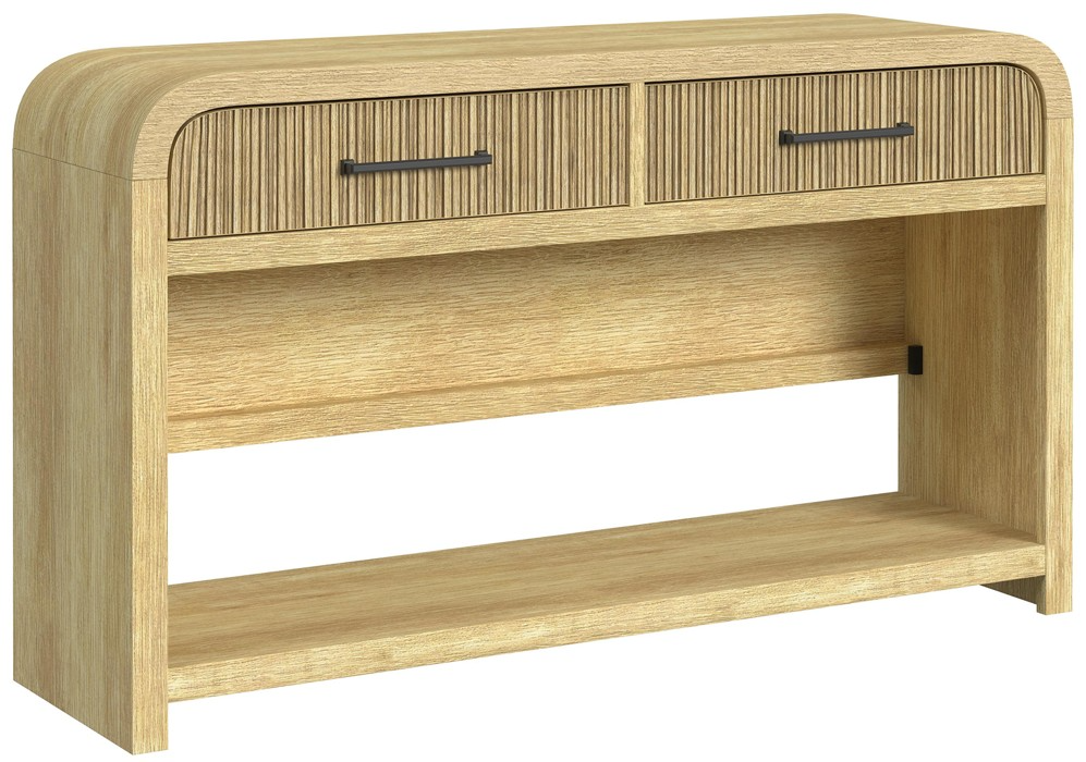 Lustrous metal handles adorning intricately fluted drawer fronts elevate the piece's visual appeal, while ball-bearing drawer glides ensure ease of utility. Designed for those seeking to add a refined accent to their living space, the Ridgemont Sofa Table in Natural is a perfect choice.