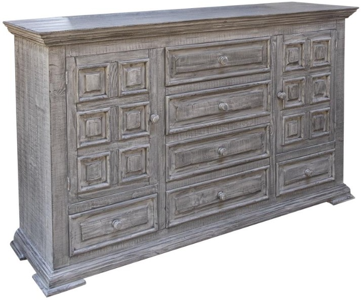 Finish is achieved through a multi-step lacquer in a gray distressed tone