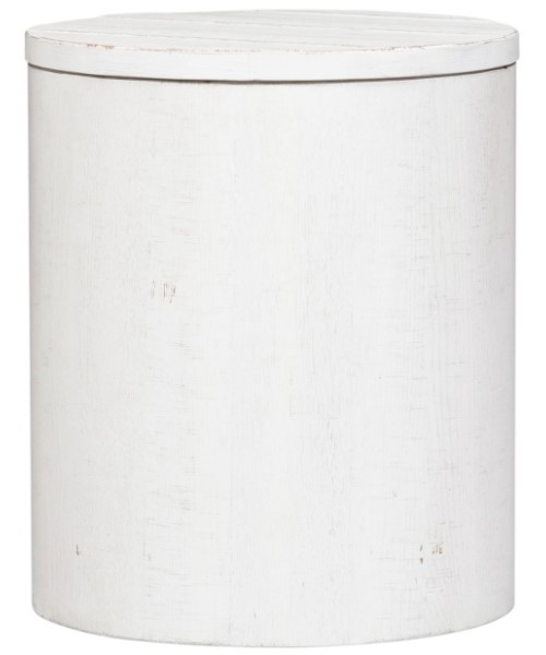 Elevate your space with the Modern Farmhouse drum end table. Crafted of poplar solids with knotty white oak veneers, this piece features a flea market white finish with heavy distressing and a removable high-low planked top that reveals an abundance of storage.Read More