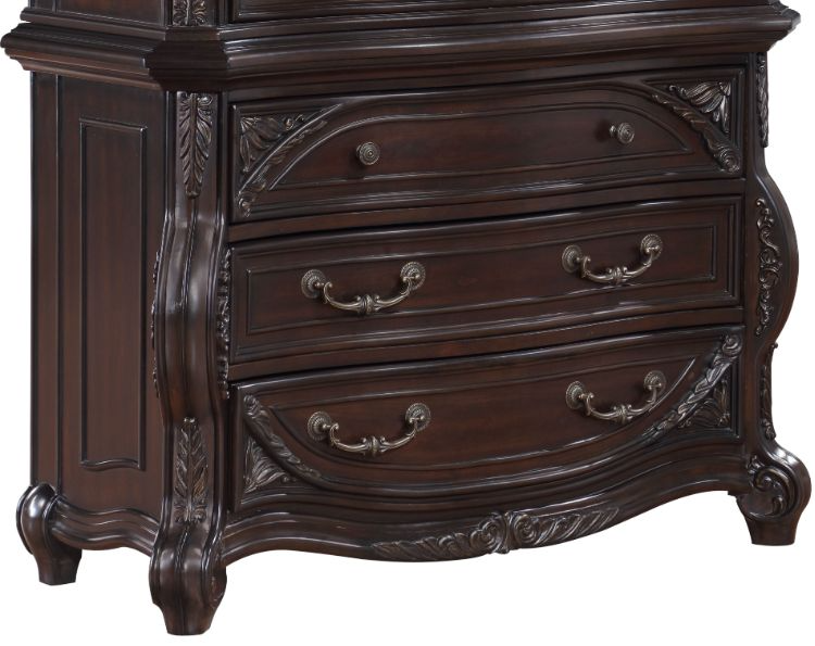 Traditional Elegance: Showcasing ornate carvings and elegant drawer pulls, this design embodies timeless sophistication and exceptional craftsmanship. The signature circular carving, a hallmark of the collection, is prominently displayed on the fronts of the chest, adding a touch of distinction and harmony