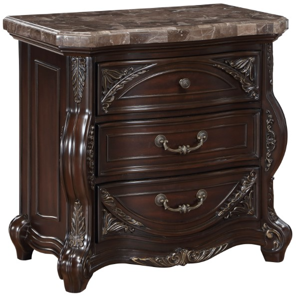 Traditional Elegance: Showcasing ornate carvings and elegant drawer pulls, this design embodies timeless sophistication and exceptional craftsmanship. The signature circular carving, a hallmark of the collection, is prominently displayed on the fronts of the nightstand, adding a touch of distinction and harmony