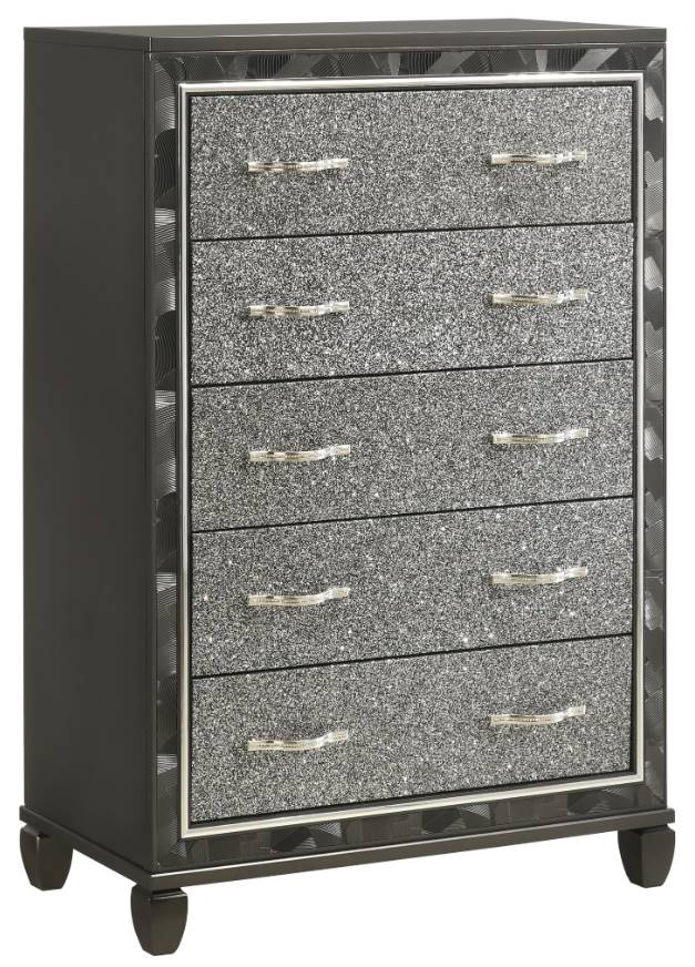 Glossy black textured black inlays and mylar trim frame the drawers, which show off a crushed crystal look decorative laminate front topped by brushed chrome finish handles with inset crystal accents