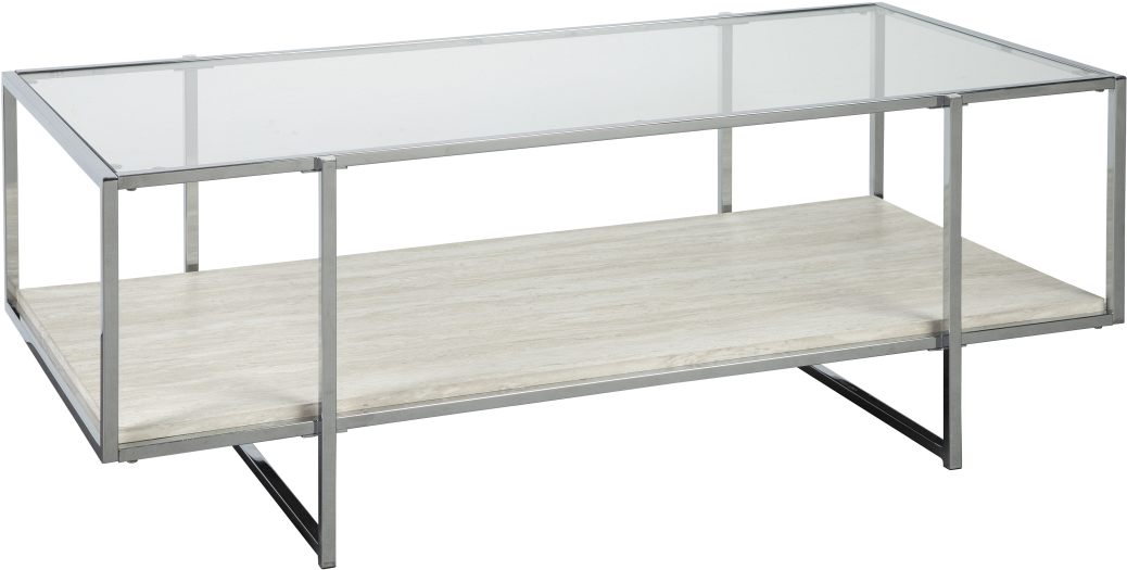 Contemporary style gets a modern attitude in this cocktail table. A tempered glass top showcases the replicated travertine stone shelf. The box design of the metal frame creates open space to offer the illusion of more room. Assembly required for this product.Read More