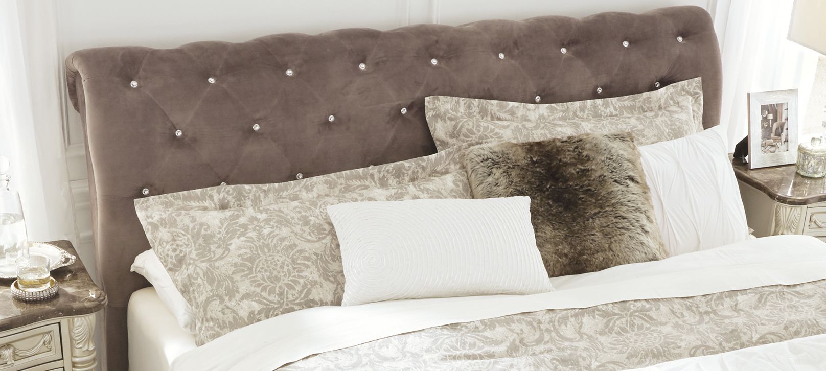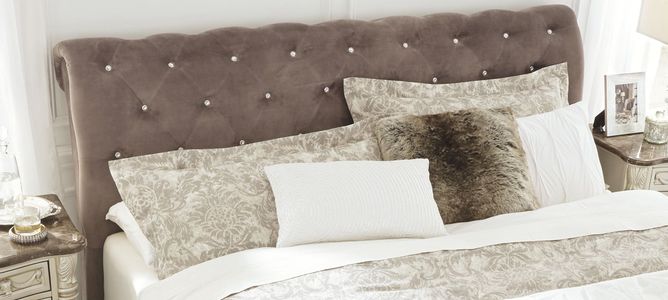 The Cassimore queen upholstered headboard features button tufting, faux-crystal buttons, and soft upholstery.