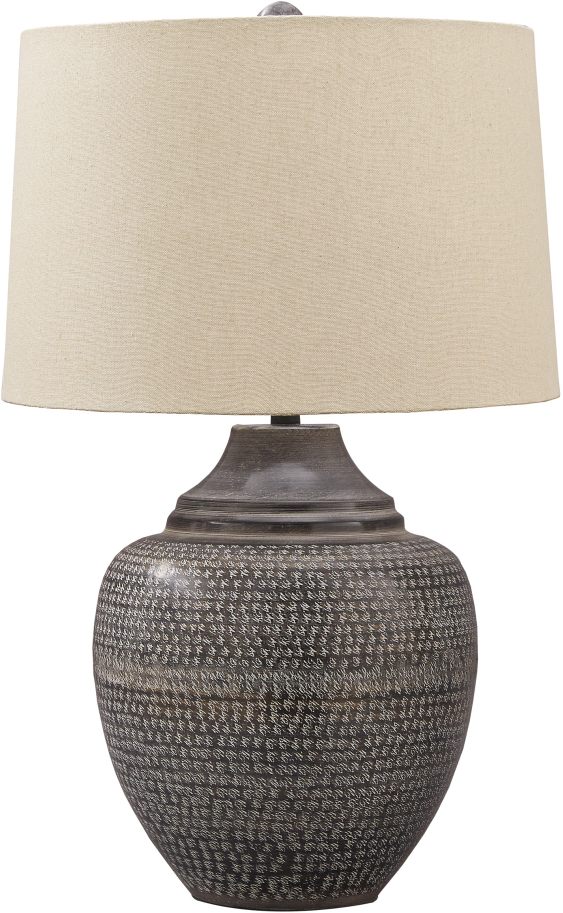 The earth-tone finish of the Olinger table lamp is versatile with a range of color schemes and complements your space. The soft lighting from a modified drum shade provides background mood-lighting, perfect in any room.