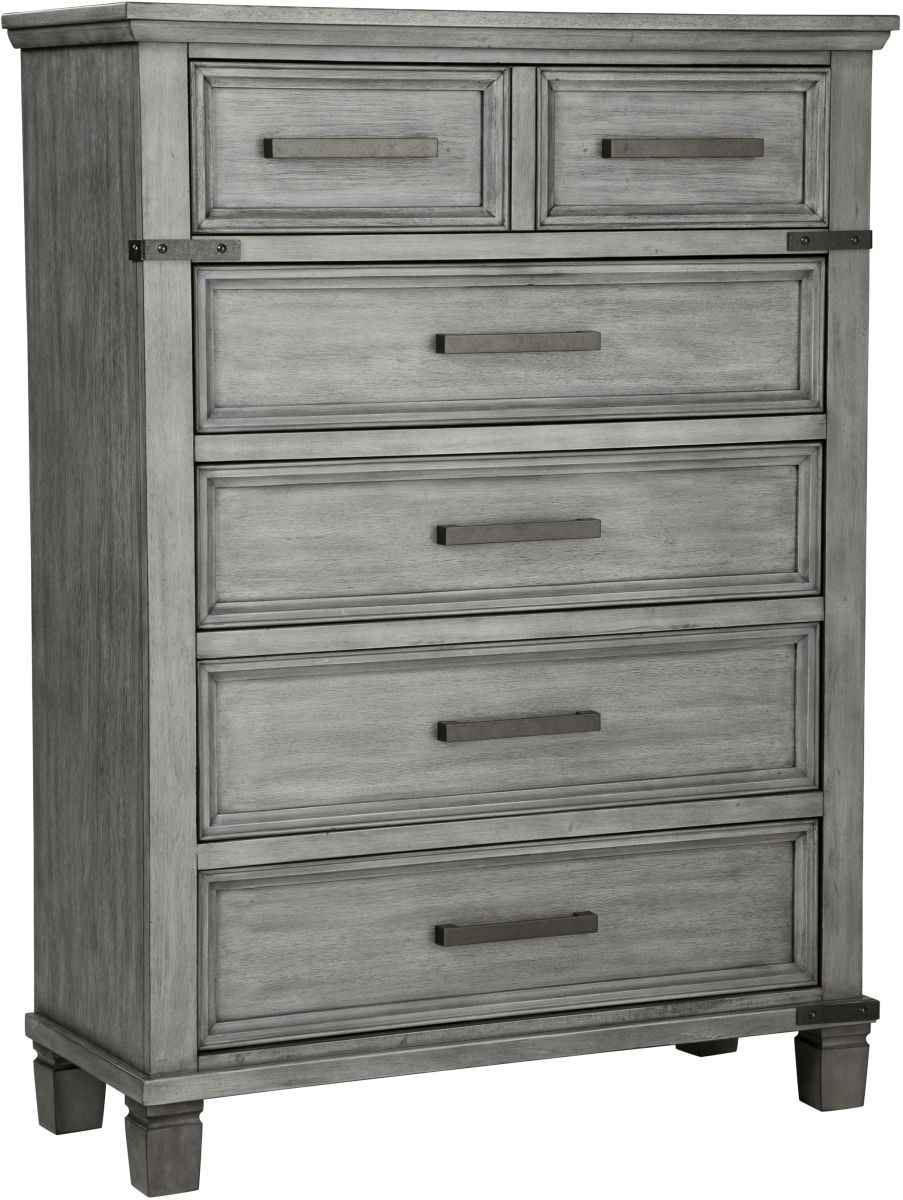 What's old is what's new with this chest. Serving up a fresh look in urban farmhouse style, the eclectic piece features a light weathered gray finish with dark aged bronze-tone bar pulls and metal straps for a casually cool sensibility. Profiled drawer frames, thick-profiled top moulding and tapered legs are the earmarks of timeless design.Read More